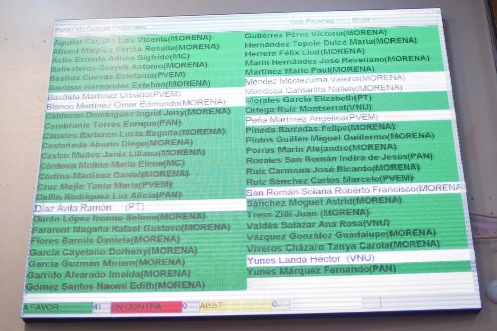 Por unanimidad, el Pleno de la LXVII Legislatura aprobó el dictamen de decreto que reforma el artículo 230 BIS del Código Financiero de Veracruz, por el cual los recursos obtenidos por la venta de alimentos en tiendas escolares del sistema público en el Estado sean destinados para la mejora y conservación de la infraestructura física de los mismos y servicios correlacionados.