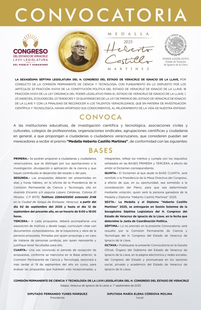 Xalapa, Ver., 03 de septiembre de 2025.- En cumplimiento de lo dispuesto en la Ley de Premios del estado y para reconocer a los talentos que en materia de investigación científica y tecnológica hayan aportado sus conocimientos al mejoramiento de la vida de Veracruz, el Congreso del Estado, por conducto de la Comisión Permanente de Ciencia y Tecnología, emitió la convocatoria para proponer a personas candidatas a la medalla Heberto Castillo Martínez, edición 2025.